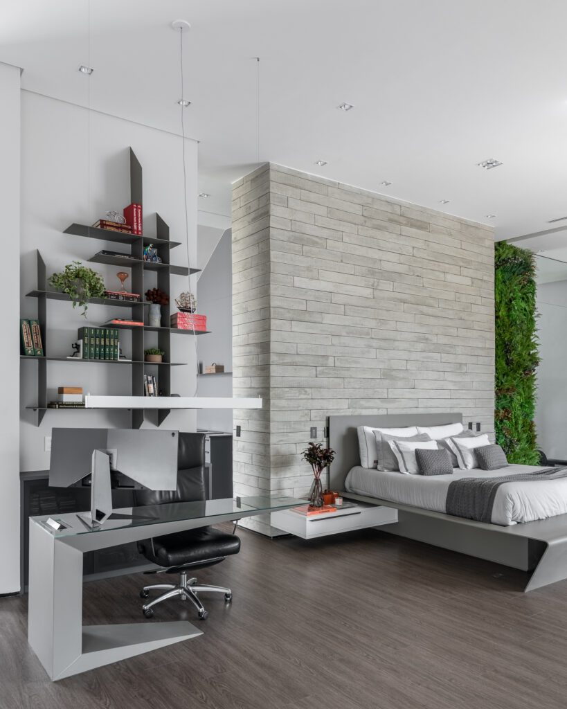 As suítes foram adaptadas para necessidades exclusivas, incluindo uma master ampla com closet em vidro reflecta fumê, home office, academia e até bicicletário.