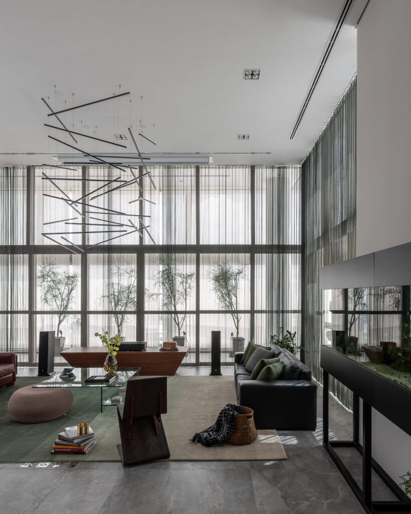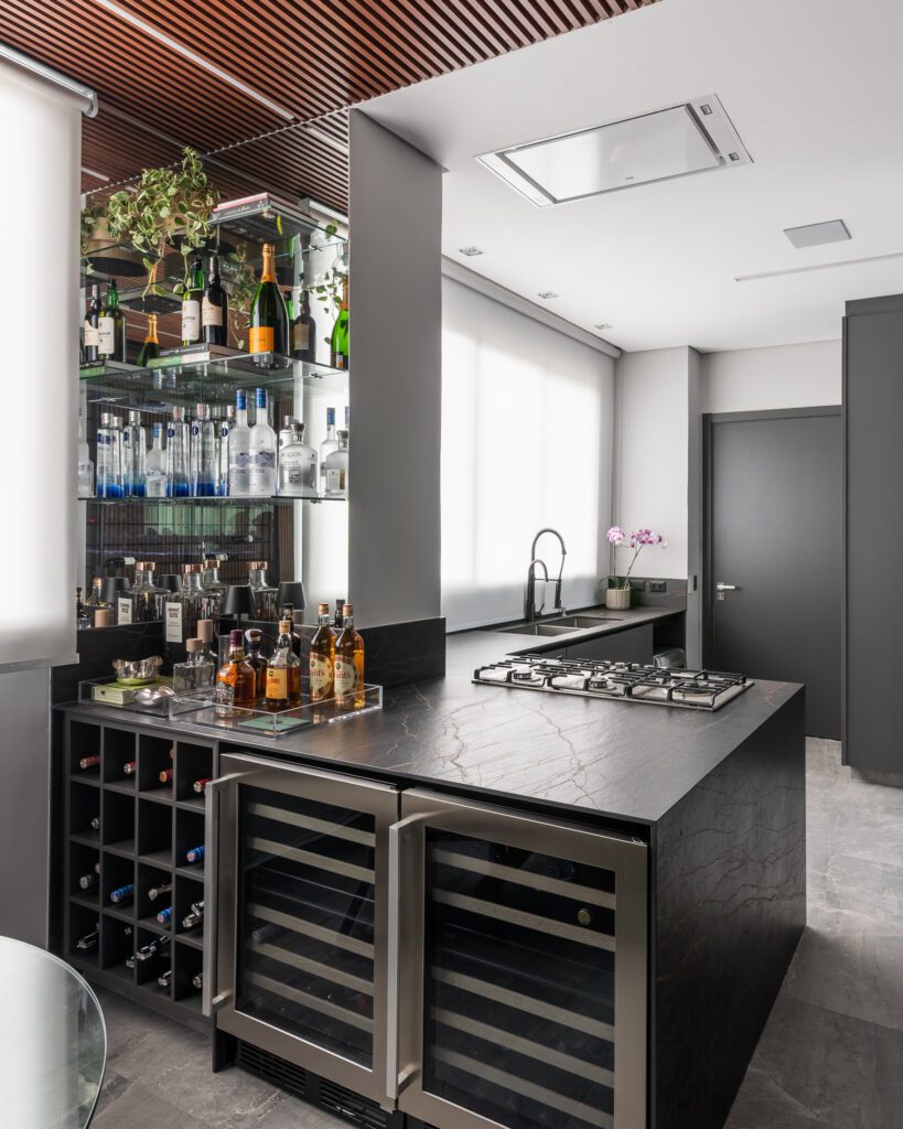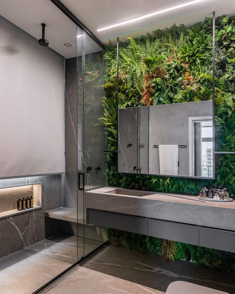 A seleção de materiais trouxe personalidade e sofisticação ao projeto. Entre os destaques estão a parede verde no banho master, a cortina de malha de aço no living em contraste com os painéis de madeira, a pedra Hijau no lavabo e as bancadas em Dekton.