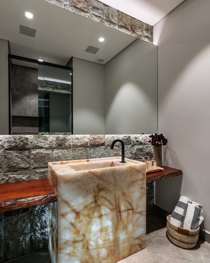 O lavabo, que também funciona como vestiário, atende de forma prática a área da piscina, reforçando a funcionalidade do espaço.